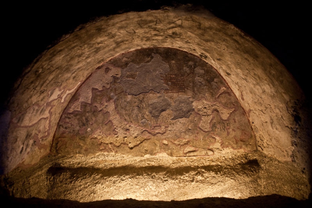 The “arkosolia” were decorated with colors (red fascia on the crown and dark blue color on the spandrel’s surface), but today only scare traces of their colorful decor are preserved.